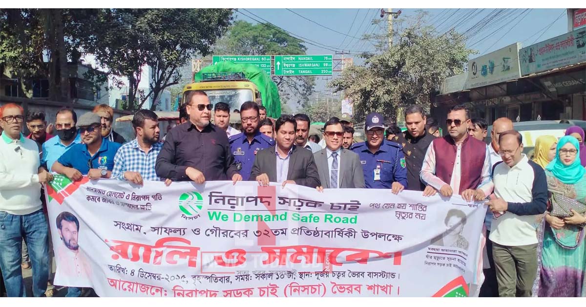 নিরাপদ সড়ক চাই (নিসচা) এর ৩২তম প্রতিষ্ঠাবার্ষিকী উপলক্ষে ভৈরবে বর্ণাঢ্য র্যালি ও কম্বল বিতরণ কর্মসূচি অনুষ্ঠিত হয়েছে। আজ ৪ ডিসেম্বর, বৃহস্পতিবার সকালে নিসচা ভৈরব শাখার আয়োজনে র্যালিটি শহরের প্রধান প্রধান সড়ক প্রদক্ষিণ করে। পরে নিসচা কার্যালয়ে দুই শতাধিক হতদরিদ্র মানুষের মাঝে কম্বল বিতরণ করা হয়। অনুষ্ঠানে প্রধান অতিথি ছিলেন উপজেলা নির্বাহী অফিসার কে.এম. মামুনুর রশীদ। সভাপতিত্ব করেন উপজেলা বিএনপি সাধারণ সম্পাদক ও নিসচা ভৈরব শাখার সভাপতি মোঃ আরিফুল ইসলাম।