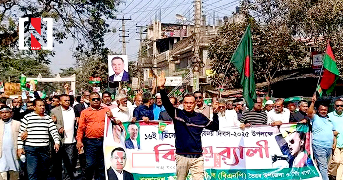 মহান বিজয় দিবস উপলক্ষে কিশোরগঞ্জের ভৈরবে উপজেলা ও পৌর বিএনপির উদ্যোগে এক বর্ণাঢ্য বিজয় র্যালি অনুষ্ঠিত হয়েছে। মঙ্গলবার (১৬ ডিসেম্বর) সকাল ১০টায় ভৈরব হাজী ফুল মিয়া ফিলিং স্টেশন সংলগ্ন গোধূলি সিটি এলাকা থেকে র্যালিটি শুরু হয়।