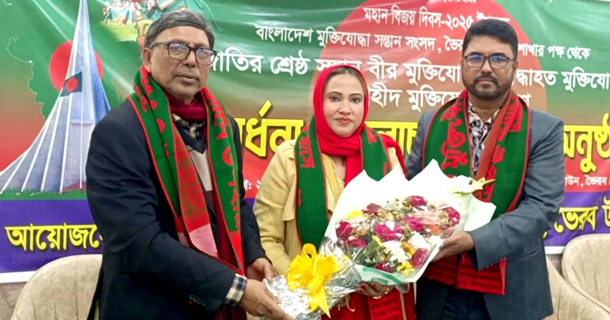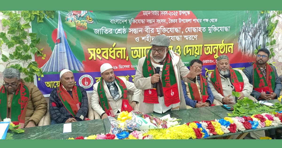 কিশোরগঞ্জের ভৈরবে ৫০জন বীরমুক্তিযোদ্ধাকে সংবর্ধনা ও উপহার প্রদান করে শ্রদ্ধা নিবেদন করা হয়েছে। বাংলাদেশ মুক্তিযোদ্ধা সন্তান সংসদ, ভৈরব উপজেলা শাখার উদ্যোগে সোমবার (২৯ ডিসেম্বর) সন্ধ্যা ৬টায় স্থানীয় ফুড প্যালেস রেস্টুরেন্টের হলরুমে এ সংবর্ধনা অনুষ্ঠানের আয়োজন করা হয়। অনুষ্ঠানে সভাপতিত্ব করেন সংগঠনের সভাপতি ও বীর মুক্তিযোদ্ধার সন্তান, যুগান্তর প্রতিনিধি আসাদুজ্জামান ফারুক। প্রধান অতিথি হিসেবে উপস্থিত ছিলেন উপজেলা বিএনপির সভাপতি মো. রফিকুল ইসলাম।