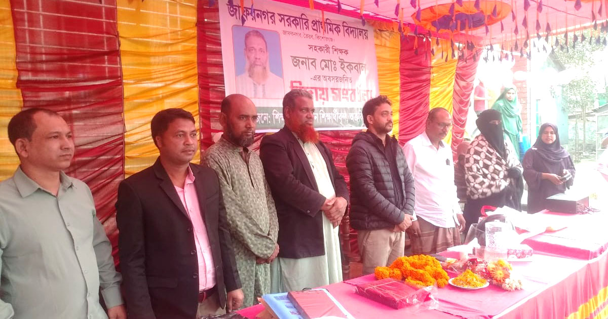 কিশোরগঞ্জের ভৈরব উপজেলার জাফরনগর সরকারি প্রাথমিক বিদ্যালয়ের সহকারী শিক্ষক মো. ইকবাল দীর্ঘ কর্মজীবন শেষে অবসর গ্রহণ করেছেন। এ উপলক্ষে আজ বৃহস্পতিবার দুপুরে বিদ্যালয় কর্তৃপক্ষ ও প্রাক্তন শিক্ষার্থীদের উদ্যোগে এক বিদায় সংবর্ধনা অনুষ্ঠানের আয়োজন করা হয়।